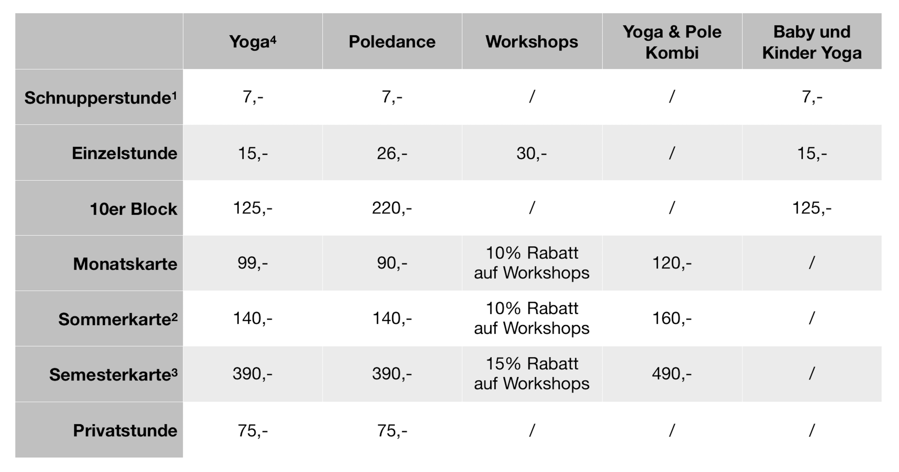 1) Jeweils nur einmal einlösbar 2) Gültig Juli & August 3) Wintersemester: Sep – Jan / Sommersemester: Feb – Jun 4) Gültig auch für Stretching & Strong4Pole